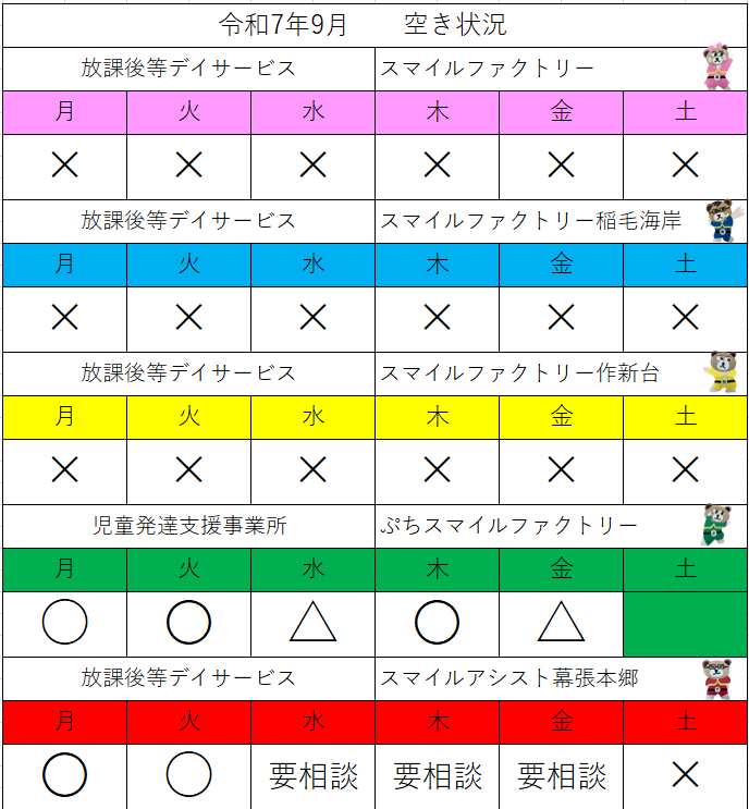 こちらのお知らせでは毎月の月初めに各施設の空き情報を掲示していきます。現在利用している方、新規の方どちらでもご利用をお待ちしております。