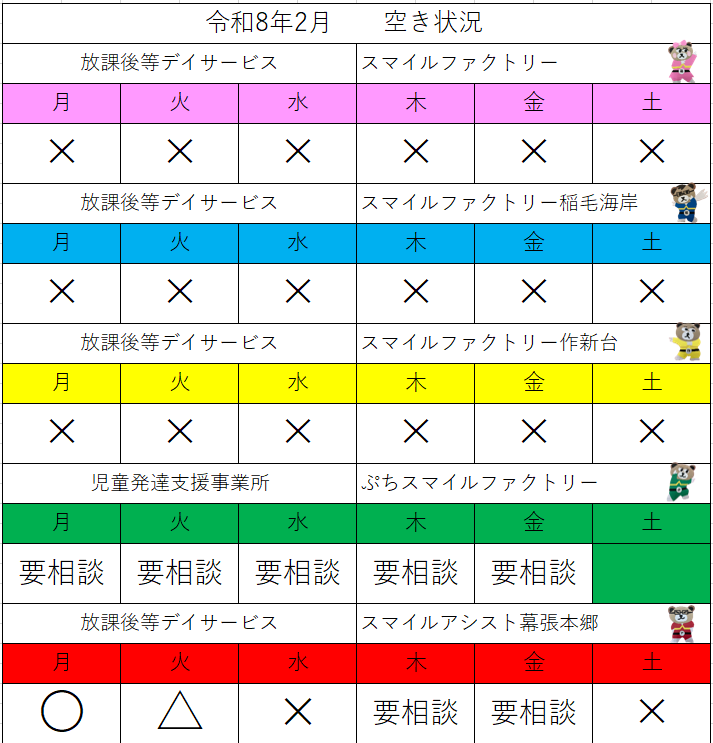 2月の各施設の空き状況です。